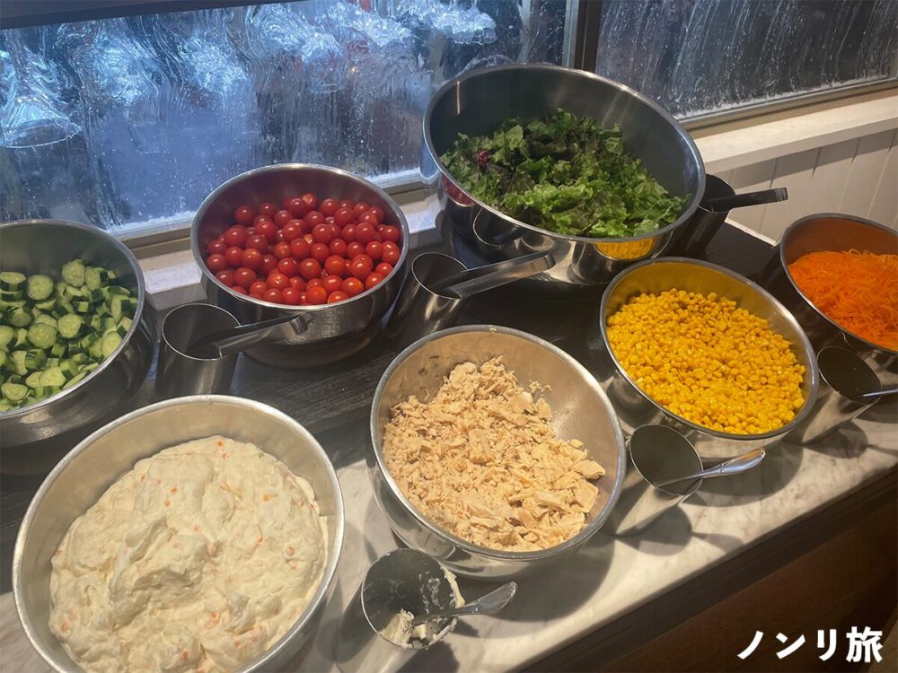 新鮮な生野菜とポテトサラダ、朝から野菜が摂れるのは嬉しいです。