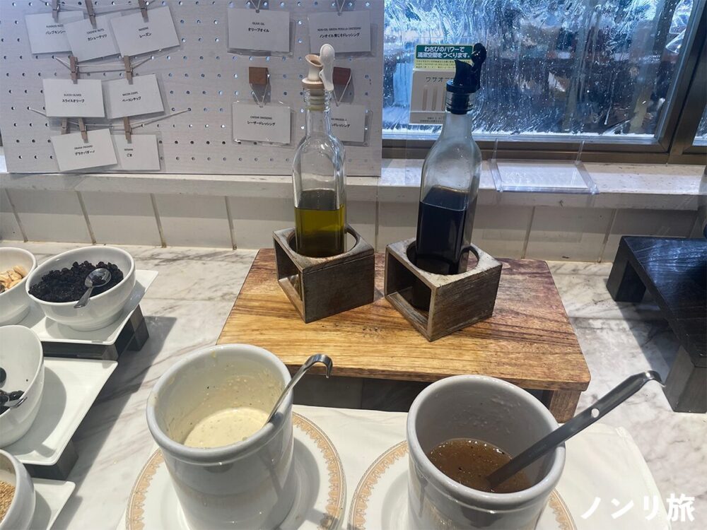 ドレッシングやオリーブオイル、バルサミコ酢など豊富にあります。