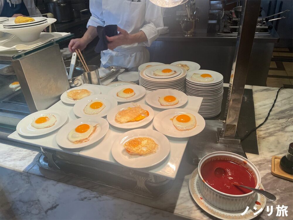 ライブキッチンでは目玉焼きとオムレツをいただけます。