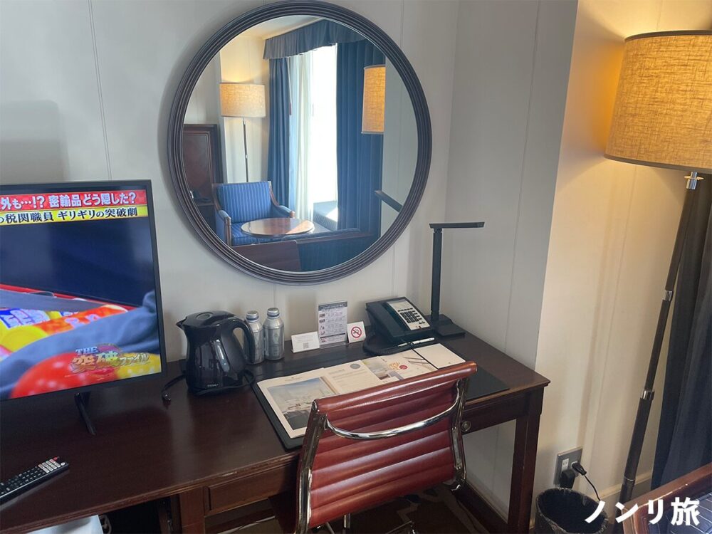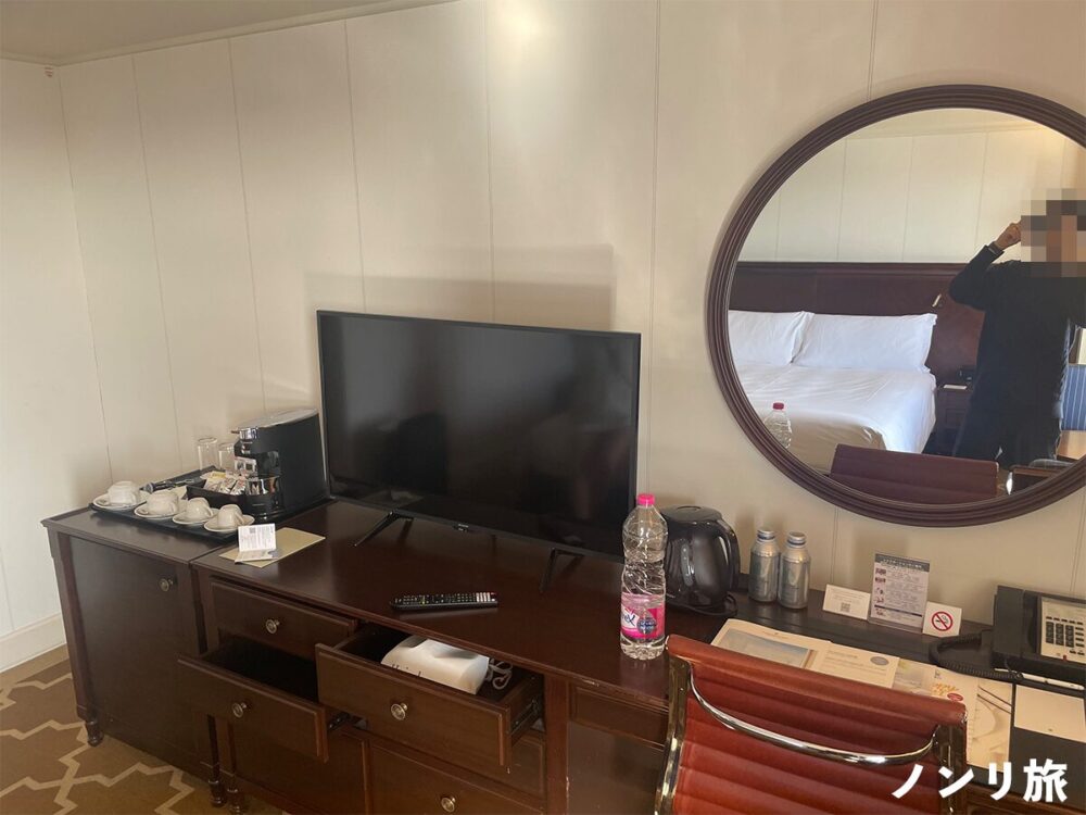 長机にはアメニティやテレビなどが置いてあり、PC作業ができるスペースも十分に確保されています。