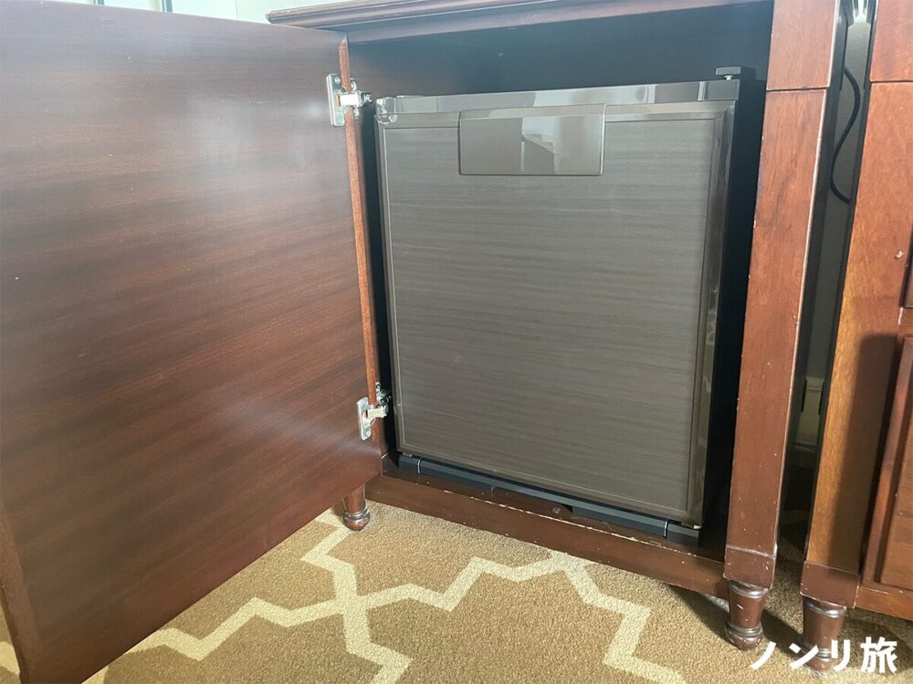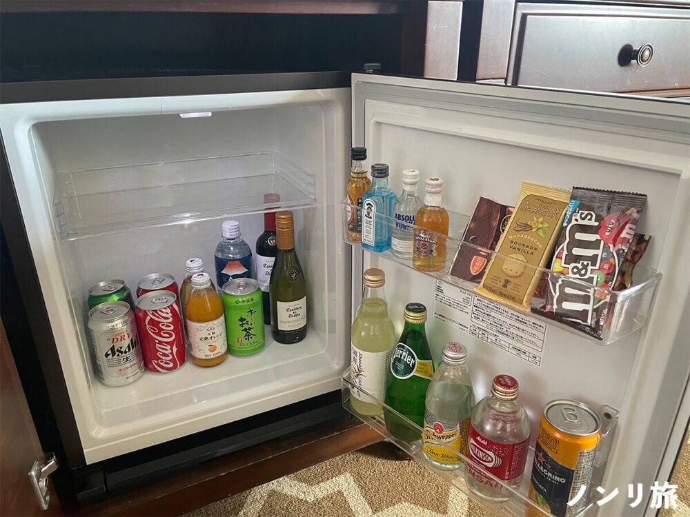 小型冷蔵庫の中にはアルコールやドリンク、お菓子が入っています。