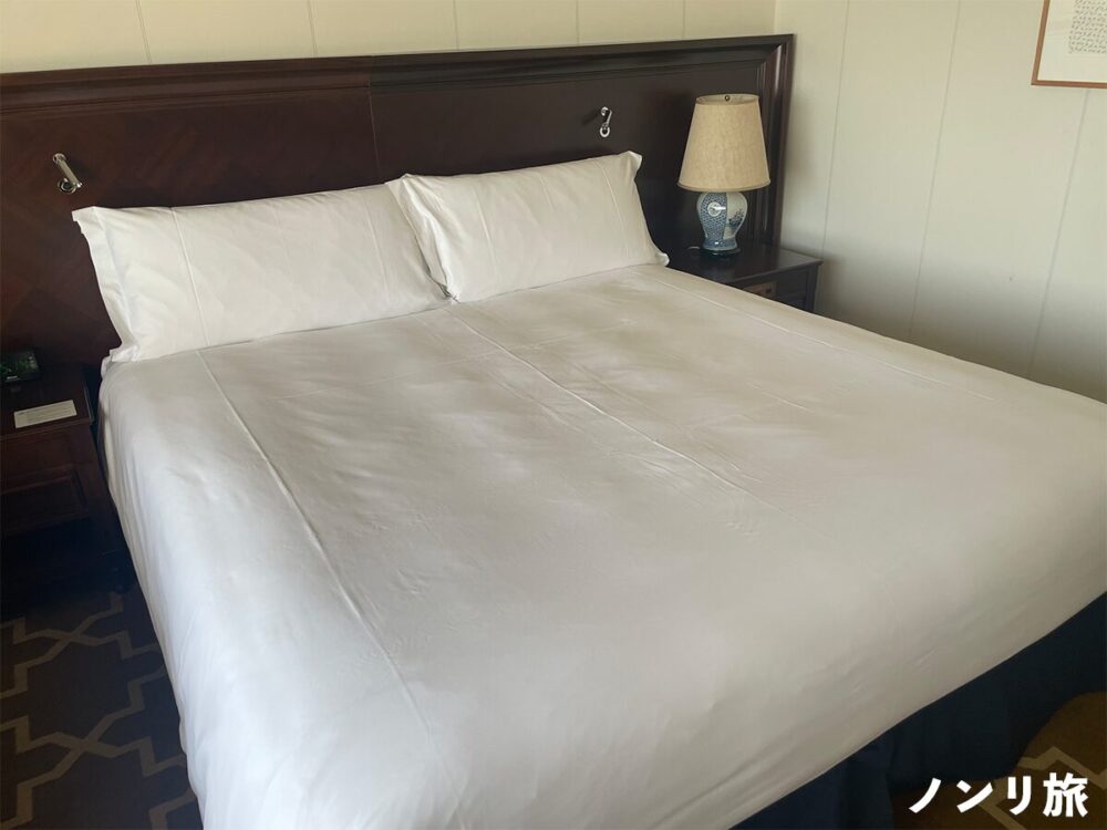 ベッドはキングダブルベッド、窮屈さを全く感じさせない上質なベッドでぐっすり眠ることができました。