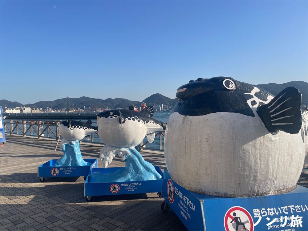 お土産や食事を楽しんだ後は、フグのオブジェクトと記念撮影をして、旅の最後を締めくくりましょう!