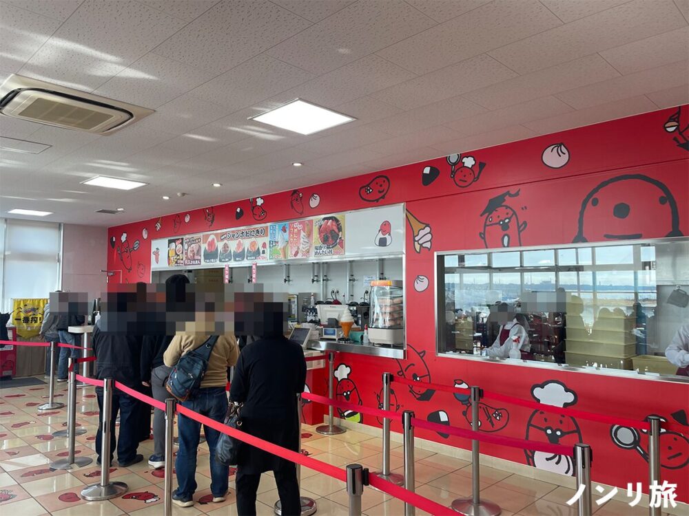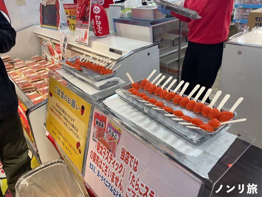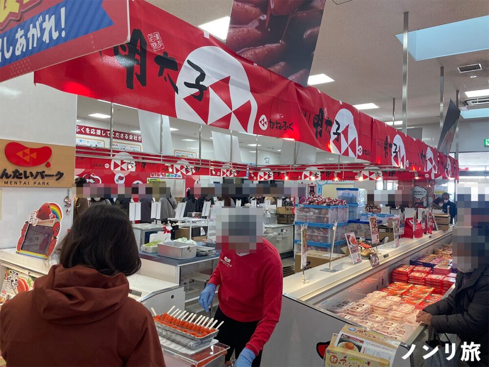 店内ではお土産用の明太子を買ったり、試食をしたりと、賑わっています。